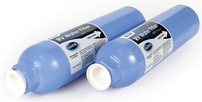 Camco TastePURE KDF RV Water Filter is a larger capacity RV water filter that lasts an entire season. Greatly reduces bad taste, odors, chlorine and sediment in drinking water with a 100 micron sediment filter. Durable in-line, exterior mount filter has a wider body to increase flow. Pack of 2. Not designed for fish tanks or ponds. No testing has been done for this purpose.