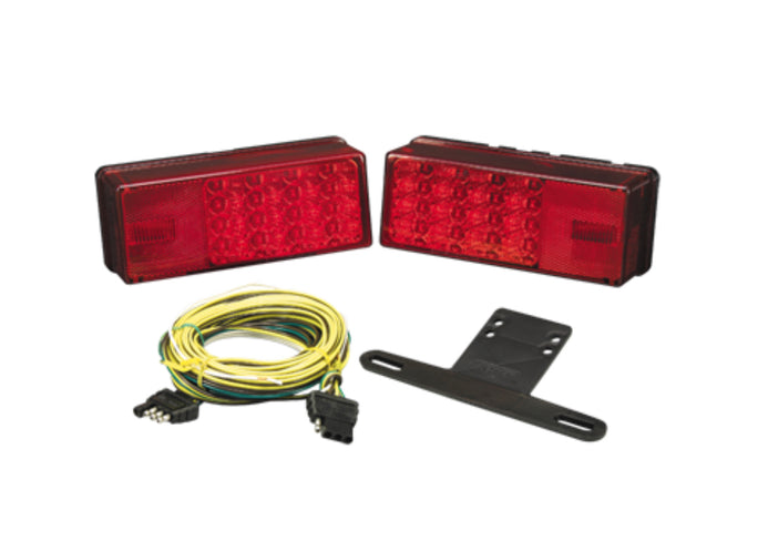 Kit comes complete with two low profile taillights, 25' trailer wiring harness cable with molded 4-flat plug, 4' four wire car wiring harness cable with molded 4-flat plug and license plate bracket.