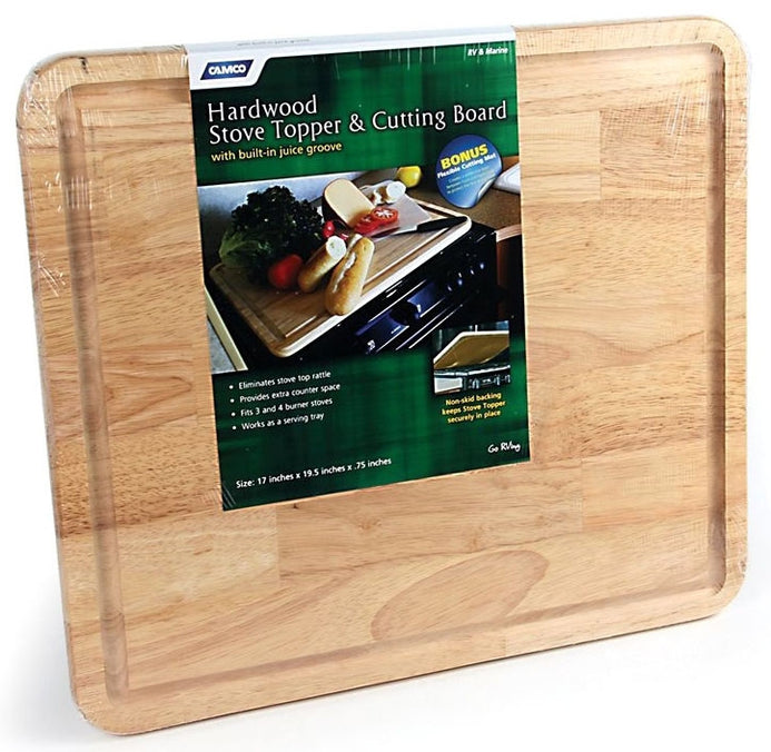 Camco's Stove Topper and Cutting Board won't nick or dull knives. The non-skid backing holds the board securely in place and doubles as a serving tray. A flexible cutting mat is included for easy pouring of chopped fruits and vegetables. Selected hardwoods are treated to preserve and enhance the natural beauty of wood. Designed to fit 3 or 4 burner stoves in your RV. Great for use in the home kitchen.