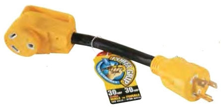 Camco RV 12" 30M/30F PowerGrip Generator Adapter is a 3-prong adapter for use with Recreational Vehicles. Designed to connect a generator with a L5-30 locking receptacle to an RV that uses a standard RV cord set (TT-30) to connect to 120V AC shore power. It features a patented PowerGrip handle to help make unplugging easier and is rated for 125V/3750W.