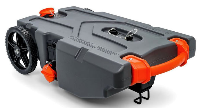 Large, Heavy-Duty, No-Flat Wheels with Bearings Make Transport Smooth and easy and Removable Steel Tow Adapter Allows You to Easily Roll the Tote Tank Like a Suitcase, or Tow it Slowly Behind a Golf Cart or Truck