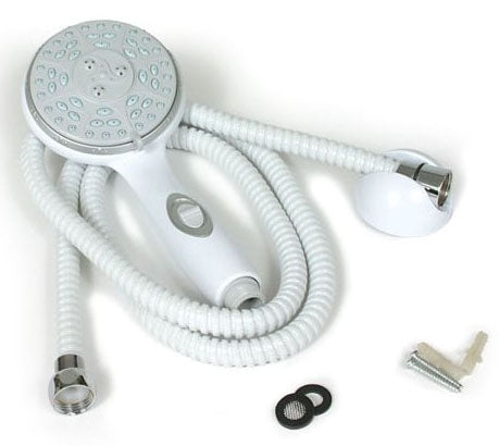 Enjoy longer showers with Camco's ergonomically designed, handheld RV showerhead. Handy on/off switch allows you to pause water flow while shampooing, greatly reducing the amount of water used. This showerhead features five spray patterns from a drenching rain to a gentle massage. This complete kit includes 60" shower hose, showerhead, washers, wall mount and hardware. The shower flex hose features built-in connectors for easy installation to a standard 1/2" shower arm and reinforced construction to eliminate hose kinking.