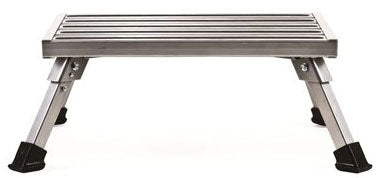 Maximum strength with minimum storage space. Sturdy 19 x 14.5 inch platform with grip tape for a secure step. Legs fold out quickly and snap into place providing an 8 inch stool. Non-slip rubber feet for greater stability. Legs fold in for compact storage. Storage height is 3 inch.
