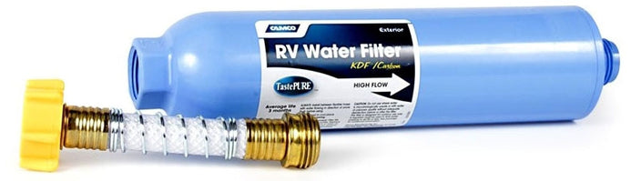 Camco TastePURE RV/Marine Water Filter with Flexible Hose Protector reduces bad taste, odor, chlorine and sediment in drinking water with a 100 micron sediments filter. Durable in-line, exterior mount filter has a wider body to increase flow. Includes flexible hose protector to minimize kinking that could impede water flow. Not designed or tested for fish tanks or ponds. NSF 42 listed.