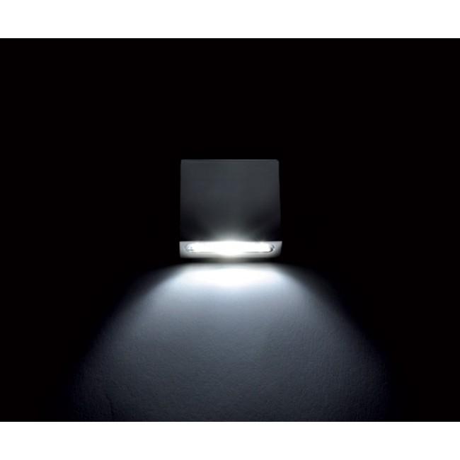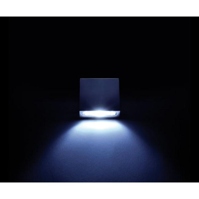 The Gladis is an IP65 led courtesy light. It has a 43mm square trim composed of AISI stainless steel. This unit is available in warm, daylight, and blue led bulb colors.